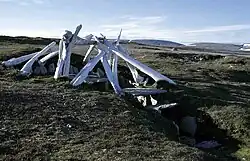 Qarmaq (plural: "qarmat")[1] is an Inuktitut term for a type of inter-seasonal,[2] single-room family dwelling used by Inuit. To the Central Inuit of Northern Canada, it refers to a hybrid of a tent and igloo, or tent and sod house. Depending on the season, the lower portion was constructed of snow blocks or stone, while the upper portion used skins or canvas.[3] To the Kalaallit of Greenland, qarmaq refers to the dwelling's wall.[4] Qarmaq were built in the transitional seasons of fall and spring with a circular wall of stone, sod, or blocks of snow, a framework usually made from animal bones, which were covered with a skin.[5]