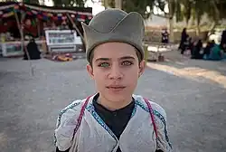 ![]() Qashqai traditional market (top) Qashqai boy wearing a traditional hat (bottom) | |
