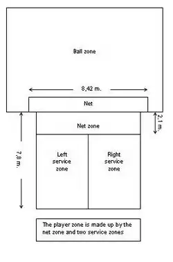 The game is played on a court a little smaller than a tennis court with both players placed on the same side of the net. The player side of the net measures 7.6 * 7.8 m, and the other side of the net should be app. 10 * 12 m, but there are no exact rules for this.