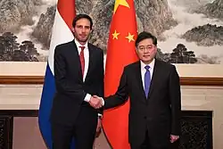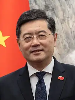 Qin was appointed as Minister of Foreign Affairs of China on 30 December 2022, succeeding Wang Yi.[18][19] He vacated the post of Chinese ambassador to the United States on 5 January 2023.[20] Qin was appointed as a State Councilor during the first session of the 14th National People's Congress on the nomination of the newly appointed premier Li Qiang on 12 March 2023.[21]