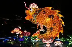 Qinhuai lantern is the traditional art of Jurong City, Jiangsu Province, in China, and part of the national intangible cultural heritage of China. Qinhuai lantern, also known as "Jinling lantern" and "Nanjing lantern", is one of the representative folk arts in Nanjing. The origin of Qinhuai lantern colour can be traced back to the Eastern Wu period, it draws on the traditional Chinese paper tie, painting, calligraphy, paper cutting, shadow puppetry, embroidery, sculpture and other arts, in the production of integrated carpentry, lacquer, painting, carving, clay sculpture, knotting and many other technical means. Qinhuai has a variety of lanterns, reaching from the traditional lanterns to lotus lanterns and lion lanterns. The variety and design of lantern works represents also current events to the time of design, such as ocean-going ships, carrier rockets, urban construction, mountain and forest landscapes.[1]