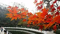 In the Southern Dynasties (420–589), there was a Qixia cottage (栖霞精舍) in the mountain, so the mountain's name Qixia derived from it. Qixia Mountain includes mountain peaks: the main peak, Sanmao Peak, with an elevation of 286 m (938 ft); Dragon Mountain, like a lying dragon, located in northeast; Tiger Mountain, like a fallen tiger, located in the northwest. Qixia Mountain has many scenic spots and historical sites. Its red autumnal leaves and especially its Dongfeitian grottos which were founded in 2000, make it a famous tourist attraction both at home and to abroad.[4]