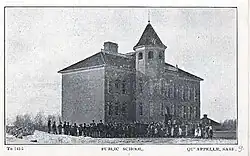 The fine yellow brick town hall and "opera house" remains marginally in use, though its auditorium has long since been closed to public use because it falls short of modern standards of safety and the town cannot bring it up.[24] Its companion building, Qu'Appelle High School, built in similar style in identical yellow brick, closed in 1973 and was demolished in 1975. The Queen's Hotel, built in 1884 (early on with the competitor of Smiths Hotel, far more briefly surviving) continued to operate, latterly largely as a town pub albeit that alcohol was briefly banned for drink in Saskatchewan after World War I, as vastly more lengthily in the USA. After steady commercial decline for many years it was destroyed by fire in 2003.