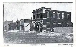 Well into the 20th century there was still a train station, some half-dozen grain elevators, a bank, post office, butcher, two general stores, a hardware store, pharmacy, the hotel — "the Queen’s Hotel, which officially opened in 1884, was lost in an early morning blaze on April 16, 2003"[28] — (and "beverage room," in the terminology of the early 20th-century Canadian West, though closed from 1915 to 1925 under Premier Walter Scott's prohibition and temperance legislation[29]), barber shop, firehall, law office, numerous service stations, several cafés, cinema (later converted to a grocery store) and a covered rink.[30] In the 1890s, there was "a flour mill, a creamery [and] a felt and boot factory."[9]