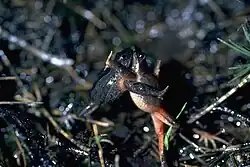 Matings in this species are relatively unique in that quacking frogs are polyandrous; about half of all matings involve more than one male, and possibly up to nine, resulting in a brood of offspring with multiple paternities.[18] Polyandrous mating is more likely among smaller males, as large males can monopolize and dominate the female during amplexus. This does not appear to be beneficial, as the efficiency of the sperm does not differ significantly in terms of sperm number, size, motility, and longevity between large and small males.[19] Furthermore, when a single male mates with a female, there is a 90–95% chance that fertilization will be successful, while there is only a 64% chance of success when three to five males mate with one female. Often this drop is due to fights that arise when other males join in an existing act of copulation, reducing the likelihood of successful sperm transfer.[20] Therefore, there is no benefit to polyandry in terms of offspring survival to offset the high cost of reduced fertilization success and occasional female mortality.[21] It is thus unclear why polyandry is prevalent in this species, although it could possibly be due to males wanting to increase their chances of procreation with a limited number of females.