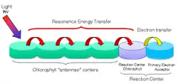 Photosynthesis refers to the biological process that photosynthetic cells use to synthesize organic compounds from inorganic starting materials using sunlight.[61] What has been primarily implicated as exhibiting non-trivial quantum behaviors is the light reaction stage of photosynthesis. In this stage, photons are absorbed by the membrane-bound photosystems. Photosystems contain two major domains, the light-harvesting complex (antennae) and the reaction center. These antennae vary among organisms. For example, bacteria use circular aggregates of chlorophyll pigments, while plants use membrane-embedded protein and chlorophyll complexes.[62][63] Regardless, photons are first captured by the antennae and passed on to the reaction-center complex. Various pigment-protein complexes, such as the FMO complex in green sulfur bacteria, are responsible for transferring energy from antennae to reaction site. The photon-driven excitation of the reaction-center complex mediates the oxidation and the reduction of the primary electron acceptor, a component of the reaction-center complex. Much like the electron transport chain of the mitochondria, a linear series of oxidations and reductions drives proton (H+) pumping across the thylakoid membrane, the development of a proton motive force, and energetic coupling to the synthesis of ATP.