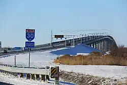 Growing road congestion in and around Montreal led to the announcement in 2006 of a federal-provincial partnership to complete A-30 as southwestern bypass ring road.[5] At that time, the section from Châteauguay to Vaudreuil-Dorion was to be tolled, however by 2009 it was decided to collect tolls only on the St. Lawrence bridge. A-30 was extended north of the St. Lawrence River (over a new crossing) to a realigned interchange with Autoroute 20 and Autoroute 540 in Vaudreuil-Dorion, afterward A-540 was annexed and renamed as an extension of A-30. As construction progressed, short sections of the original A-30 that are bypassed by the new route were converted to spur routes and assigned new route numbers; for instance the old alignment of A-30 south of Salaberry-de-Valleyfield was renamed Autoroute 530. Opened to traffic on December 15, 2012, the realigned Autoroute 30 permits motorists travelling the Quebec City–Windsor Corridor (eg Toronto to Quebec City) to bypass the segment of Autoroute 20 that runs towards into Montreal, including the section of A-20 with at-grade intersections in Vaudreuil-Dorion and L'Île-Perrot, as well as the congested stretch of A-20 that includes the Turcot Interchange and Samuel-De Champlain Bridge.[6][7][8]