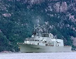 HMCS Fredericton, a Department of National Defence frigate, followed the RCMP vessel at a distance and provided necessary assistance throughout the journey, ensuring the safety of the police officers and serving as command post.