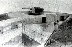 In 1901, approval had been given for two 6-inch (152 mm) guns at Princess Royal's Battery. One emplacement was to have a range of 6,000 yards (5,500 m), to bear on the enemy's land batteries. The other was to feature double the range, 12,000 yards (11,000 m), to target vessels on the Mediterranean. On 21 July 1902, work began on a 6-inch breech loading Mark VII gun with barbette armour. By November 1903, that 6-inch BL Mark VII gun had been mounted, as documented in a photograph (pictured above) of that date, with the installation finished by 24 May 1904. In December 1915, the second 6-inch breech loading Mark VII gun was mounted on the battery. It is believed to have stayed there until about 1924–1925.[9] By World War II, at least one gun was still present, a Bofors 40 mm L/60 gun anti-aircraft gun, as documented in an Imperial War Museum photograph (pictured at left).[20]