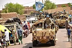 In June 2021 'C' Squadron, 1st The Queen's Dragoon Guards deployed to Mali with 2nd Battalion The Royal Anglian Regiment to form the Long Range Reconnaissance Group for Op Newcombe rotation 2 for 6 months.[8] Op Newcombe was a peacekeeping operation in support of the United Nations Multidimensional Integrated Stabilization Mission in Mali (MINUSMA). Whilst deployed C squadron assisted in facilitating war crime investigations[9] and also came under fire for the first time since combat operations in Afghanistan 2014[10] where the welsh cavalry were also at the time. A member of C squadron QDG earned a mention in dispatches while deployed for courageous actions in the face of the enemy.[13]