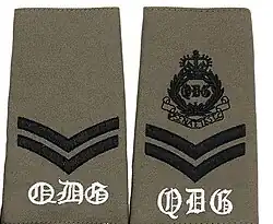In the QDG lance corporals wear two chevrons, corporals wear two chevrons surmounted by a rank badge consisting of the Bay's emblem, which is worn by all senior NCOs. Squadron quartermaster sergeants wear four chevrons with rank badge, the whole surmounted by a crown.[22]