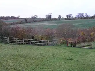The tree became known as the Queen's Oak for its association with the legend.[2] It stood around half a mile to the north-east of Watling Street, between Potterspury and Paulerspury in Northamptonshire.[6] At one point it formed part of the boundary of Potterspury Park.[7] The tree stood to the rear of the Pottersbury Lodge and several acorns from it were recovered and planted on the estate by Henry Newton in the mid-19th century.[8][2] By 1879 it measured 8.83 metres (29.0 ft) ingirth and its hollow trunk could accommodate 18 people.[2] By 1937 an avenue of lime trees had been planted leading up to the Queen's Oak.[9]
