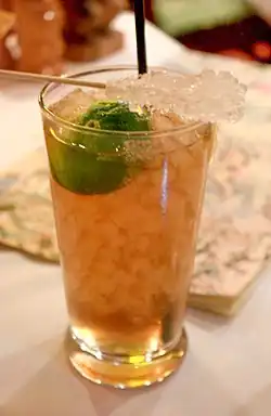 The drink is traditionally served in a Collins or highball glass.[2][3][8] In the glass, mint leaves are muddled with lime juice and syrup (Demerara or simple).[2][3][8] Demerara rum, Angostura bitters, and then crushed ice is added.[2][3][8] The drink is swizzled with a swizzle stick until the drink is mixed and the glass is completely frosted.[2][3][8] A bar spoon can substitute the swizzle stick.[3][9] The swizzle method allows the muddled mint to stay at the bottom.[3] Sometimes, bitters are added to the crushed ice to give the ice layer a red appearance, so that the drink will have green, gold, and red layers.[3] The drink is then garnished with a mint sprig.[2][3][8]