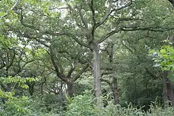 The wood is an ancient oak-hornbeam woodland, which features English oak and occasional beech which provide a canopy above cherry, field maple, hazel, holly, hornbeam, midland hawthorn, mountain ash and both species of lowland birch. The scarce Wild Service Tree (which is evidence of the Woods's ancient origin) is scattered throughout the wood. The Wood has a small adventure playground, but no park or playing fields, and has never been subjected to intensive management of the type practised at Highgate Wood and accordingly there is greater diversity of flora and fauna - Bantock (1984) found a significantly greater number of ground feeding birds present in the Wood when compared to Highgate Wood, which he attributed to the greater structural diversity and denser shrub layer present. Queen's Wood is a Local Nature Reserve[3][4] and a Site of Metropolitan Importance for Nature Conservation.[5]