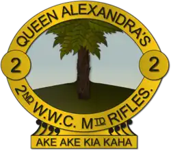 The regimental badge is of a punga tree encircled by a baggage strap, bearing (above) Queen Alexandra's and (below) 2nd W.W.C (Wellington West Coast) Mtd Rifles. Below this is the regiments motto "Ake Ake Kia Kaha" meaning "For ever and ever, be strong". This was derived from the war-cry of the Third (Rough Riders) Contingent of the South African Volunteers (Boer War). The original prototypes were made of solid copper, but when issued were of blackened gunmetal. The badge is worn on the New Zealand Army rifle green beret, with RNZAC personnel wearing the badge over the RNZAC green patch. Collar badges of the same pattern are worn with No.2 Dress (mess kit), and No.4 Dress (service dress). The QAMR belt has horizontal stripes of black, amber, black. These colours are those of the Taranaki provincial colours which were adopted by the regiment. In 1993, for ceremonial purposes, the traditional mounted rifles slouch hat was reintroduced with a khaki/green/khaki puggaree. The scarlet and blue mess uniform is that of the RNZAC.[2]
