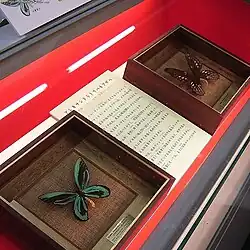 The species is also highly prized by collectors, and because of its rarity, this butterfly fetches a very high price on the black market, reportedly US$8,500-10,000 in the United States in 2007.[10] In 2001, renowned Canadian researcher Gilles Deslisle was fined CA$50,000 for illegally importing six specimens of Queen Alexandra's birdwings.[11] In 2007, "global butterfly smuggler" Hisayoshi Kojima pleaded guilty to 17 charges after selling a number of endangered butterflies, including a pair of Queen Alexandra's birdwings priced at US$8,500, to a special agent with the U.S. Fish and Wildlife Service.[10]