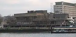 The north-west facade, by Waterloo Bridge, although stained by pollution and rainwater, is a good example of the massive concrete forms popular in 1960s brutalist architecture in Britain. A slightly raised area, resembling a low stage is provided facing Waterloo Bridge. This may have been intended for outdoor performances.