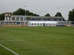 The main element part of the stadium is the pavilion, completed in 1953. This is a Grade II listed building built in Art Deco style,[11][1] and serves as the clubhouse, main stand and changing rooms. Butler's Bar serves fans on matchdays. Opposite the main stand is a second, small seated stand, while behind each goal, inside the perimeter of the running track, are two covered terraces.