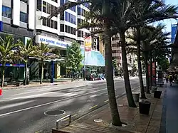 This involved the widening and relaying of footpaths with basalt kerbstones and paving. Granite insets, designed in consultation with the local Māori (Ngati Whatua iwi), as well as recycled redchip pavers from the existing footpath, were used to denote special areas – such as those related to the existence of the old Waihorotiu Stream. New street furniture (such as multi-purpose poles for lighting, signage and pennants) and new trees and other landscaping were added to create a 'boulevard effect'.[18] The liquidambars and Nīkau Palms chosen for the new design touched off heated public discussion in 2006 as their inclusion came at the destruction of previous, established trees (which were not native flora of New Zealand, and thus not retained in the new landscaping plan).[19]
