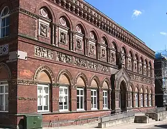 Burslem School of Art lies opposite the Wedgwood Institute. The architect was Absalom Reade Wood (1851–1922), who designed many buildings in the local area including Tunstall Town Hall and Kidsgrove Town Hall, and also designed Victoria Park in Tunstall.[10] The foundation stone was laid in 1906 by the Earl of Dartmouth, and it opened in 1907. It is built of brick with terracotta details; it is Grade II listed. Former students include Clarice Cliff, Susie Cooper and William Bowyer.[1][11][12]