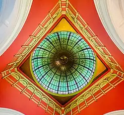 The building, on the "scale of a cathedral"[6] was designed by George McRae, a Scottish architect who had emigrated to Sydney in 1884.[7] At the time, Sydney was undergoing a building boom and since in architecture "no one school or style predominated", McRae produced four designs for the building in different styles (Gothic, Renaissance, Queen Anne and Romanesque) from which the council could choose.[3]: page:50 The council's choice of Victorian Romanesque style conveys the influences of American architect Henry Hobson Richardson. The use of columns, arches, and a prodigal amount of detail such as was used by McRae in the chosen design are typical of Richardsonian Romanesque, an eclectic style identifiably established between 1877 and 1886.[8] The dominant feature of the building is the central dome which consists of an interior glass dome and a copper-sheathed exterior, topped by a domed cupola. Smaller domes of various sizes are on the rooftop, including ones on each upper corner of the rectangular building. Stained-glass windows, including a cartwheel window depicting the arms of the City of Sydney, allow light into the central area, and the roof itself incorporates arched skylights running lengthways north and south from the central dome. The colonnades, arches, balustrades and cupolas are of typically intricate Victorian style.