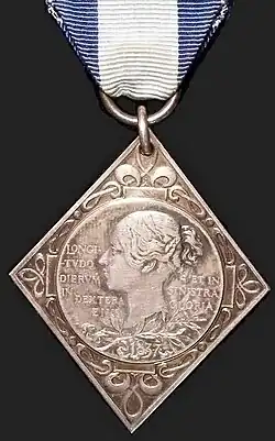 The Diamond Jubilee Medal was instituted in 1897 by royal warrant as a British decoration. The medal was awarded to members of the royal family and the court, guests and dignitaries present at the celebrations of the Diamond Jubilee of Queen Victoria and to selected soldiers and sailors who formed the jubilee parade in London.[1][2]