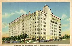 Seeing a need for quality care in the city, the Franciscan Sisters went as far as begging door to door to accrue money for the hospital.[1] Once built, the hospital kept growing in size by adding wings and new buildings, topping out at 14 stories in height.[2] Due to excess capacity, the operations of the Queen of Angels Hospital were merged with the Hollywood Presbyterian Medical Center in 1989,[1] becoming known as the Queen of Angels – Hollywood Presbyterian Medical Center.