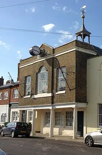 The market house was demolished and replaced by a new guildhall in 1728: this building was deemed by civic officials to project out too far into the High Street and they decided to demolish it in the late 18th century. The current building was designed in the neoclassical style, built in yellow brick and was completed in 1793.[4] The design involved a symmetrical main frontage with three bays facing onto the High Street; the ground floor was arcaded with four Tuscan order columns supporting the floor above. The central bay, which slightly projected forward, contained a Venetian window on the first floor and a parapet and a small pediment above. The outer bays were fenestrated with casement windows on the first floor. There was a projecting clock on the front of the building and, at roof level, there was a cupola with a weather vane.[1] Internally, the principal rooms were the courtroom on the first floor and the dungeon, which contained two cells, each of about 12 square feet (1.1 m2),[5] in the basement.[6]
