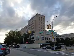 Located on the site of the current main building and nursing school were a nurses home for housing nurses, an employee's home for medical residents and hospital superintendents, and a staff building for administrative offices.[37][38][46] Along Goethals Avenue, where the Queens Gateway School and EMS station now sit, were (from east to west) the power plant, a laundry facility, a garage for ambulance storage, an industrial workshop for creating furniture and other items, and the mortuary building.[33][37][39][38][46] The morgue, which occupied the site of the school on 160th Street,[46] was a small salmon brick building,[56] and served as a municipal morgue for the entire borough.[46] This site was found to be contaminated with petroleum prior to the construction of the school.[39][57] In between Goethals Avenue and 82nd Drive, along the right-of-way of 160th Street near the current morgue, was the Queensboro Hospital which became Queens General's contagious disease division called the Queensboro Pavilion. It consisted of two buildings.[46][50] Only the power plant survives from the original 1930s campus.[34]