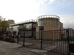 The main building, opened in 2001, is located at the southwest corner of 164th Street and 82nd Road just north of the Grand Central Parkway.[3][10] The building was designed by the Perkins and Will and Davis Brody Bond architectural firms, with a largely-glass outer facade.[11] It has 360,000 square feet (33,000 m2) of space and 200 beds.[3][10][1] It features private and semi-private patient rooms, in contrast to the large hospital wards of the previous buildings.[10] Adjacent to the south of the main building fronting the Grand Central is the only remaining pre-2000 hospital building.[3][10][12] This is the "N Building", the former Queens Hospital Center School of Nursing built in 1956.[10][13][12] It is connected to the main building by an atrium structure.[10] The nursing school graduated its final class in June 1977.[14]
