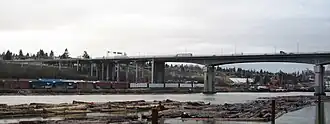 Queensborough Bridge is a highway bridge in New Westminster, British Columbia. It was built in 1960 by John Laing and Son (Canada) for the City of New Westminster and cost $4 million (equivalent to $37.5 million in 2022). The bridge spans the north arm of the Fraser River for road access from the main part of New Westminster to the suburb of Queensborough at the east end of Lulu Island, giving the bridge its name.