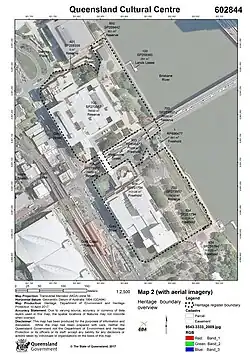- ^ a b c d e f g h i j k l m n o p q r s t u v w x y z aa ab ac ad ae af ag ah ai aj ak al am an ao ap aq ar as at au av aw ax ay az ba bb bc bd be bf bg bh bi bj bk bl bm bn bo bp bq br bs bt bu bv bw bx by bz ca cb cc cd ce cf cg ch "Queensland Cultural Centre (entry 602844)". Queensland Heritage Register. Queensland Heritage Council. Retrieved 19 February 2018.