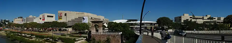 The centre comprises the Queensland Performing Arts Centre (QPAC), the Queensland Museum, the State Library of Queensland (SLQ), the Queensland Art Gallery (QAG) and the Queensland Gallery of Modern Art (GOMA). The original part was designed by Brisbane architects Robin Gibson and Partners and opened in 1985.[2] The centre is surrounded by subtropical gardens and features cafes, restaurants, bookstores, and other public facilities.