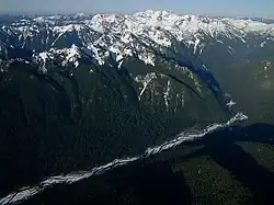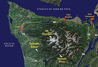 The Queets River originates at the foot of the Humes Glacier on the southeast side of Mount Olympus in the Olympic Mountains. It is also fed by Jeffers Glacier, on the south side of Mount Olympus, and Queets Glacier, on the north side of Mount Queets.[8] The river flows through a narrow canyon, cascading over Service Falls en route, to a point just below Paull Creek, where the valley opens up a bit. From there the river flows generally west to just below Kilkelly Creek, then south to just below Alta Creek, where the valley width expands once more into a typical U-shaped valley glacial river valley. The Queets then flows generally southwest, collecting numerous tributaries including the Clearwater River, Salmon River, and Sams River before emptying into the Pacific Ocean near the community of Queets.