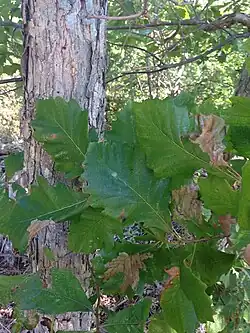 Quercus × deamii (or Quercus deamii), known as Deam's oak, is a naturally occurring hybrid of chinquapin oak (Quercus muehlenbergii) and burr oak (Quercus macrocarpa). It occurs sporadically where their ranges overlap in the eastern United States and eastern Canada.[2] It is named for self-taught botanist and state forester of Indiana Charles C. Deam, who had forwarded samples to William Trelease for description. They thought it to be a cross of Quercus alba and Q. muehlenbergii due to the large numbers of those trees growing in the vicinity.[3] Many sources still reference Q. × deamii as a hybrid of the white oak and chinkapin oak.