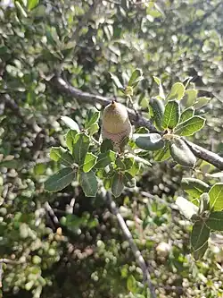 Q. aucheri grows as a small evergreen tree or shrub, attaining heights of up to 10 meters. It is close to the kermes oak (Q. coccifera), and not always distinguished from it, however, it also bears a close resemblance to other species in the Mediterranean holly oak group. In contrast to kermes oak, it has sweet instead of bitter acorns that germinate from the base instead of from the tip. Additionally, the petioles are short in Q. aucheri, and acorns are hairy, sometimes appearing white as a result.[4] The leaves are also hairy on the underside where the kermes oak's leaves are not. Leaf morphology is highly variable, and leaves with both entire and serrated margins may be found on the same tree.[5]
