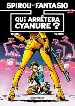Qui arrêtera Cyanure?, written by Tome and drawn by Janry, is the thirty-fifth album of the Spirou et Fantasio series, and the third of the authors. The story was initially serialised in Spirou magazine, before released as a hardcover album in 1985. The book cover was based on the poster of the James Bond movie For Your Eyes Only.