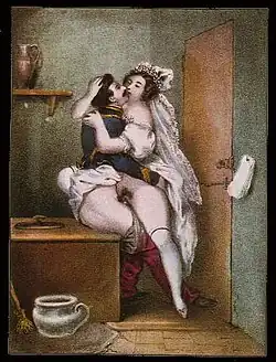 Because of the limit on available time during quickies, foreplay might be skipped and women may not have enough time to lubricate naturally.[1] In a planned encounter, the partners may dress in a manner that reduces the time needed for undressing. For example, a woman may wear a wide skirt or a front closing dress and open crotch lingerie, thongs to be pushed aside or no underwear, especially pantyhose. A man may dispense with a jacket and belt. A quickie between a heterosexual couple may generally satisfy only the man's sexual desire.[2]