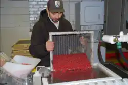 The alevin remain in the incubation trays for an additional 65 days or until they have fully absorbed their yolk sacs, after which they are known as "fry". While the time from initial fertilization to the fry stage usually takes about 105 days, the time varies depending on water temperature. The hatchery's staff moves the fry into large tanks and feeds them several times a day, monitoring their growth throughout the year, removing uneaten food and waste from the tanks, and splitting the fry into additional tanks when crowding occurs.[4]