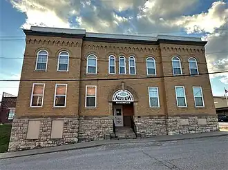 Quincy, Omaha and Kansas City Railroad Office Building, also known as the O.K. Building and Sullivan County Courthouse, is a historic office building located at Milan, Sullivan County, Missouri. It was built in 1898 by the Quincy, Omaha and Kansas City Railroad. It is a two-story, rectangular brick building on a limestone foundation. It features a Romanesque style round arched entrance and second-story window openings. From 1908 to 1940, the building was used by Sullivan County as a courthouse and served as the seat of government for the county.[2]: 5, 16