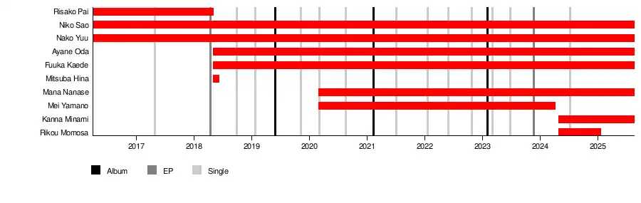 Rikou Momosa left the group on January 21, 2025.[24] Niko Sao and Nako Yuu will graduate from the group on July 2.[25]
