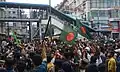 Peaceful demonstrations by the students restarted on 1 July, while public university teachers declared a strike protesting the new Universal Pension Scheme,[117] causing universities to close. Demonstrations spread nationwide as the movement became headed by a newly formed Anti-discrimination Students Movement, an umbrella organisation for the student protesters. On July 7, protestors launched the nationwide Bangla Blockade, obstructing traffic and rail in major cities and metropolises including Dhaka, Chittagong, Comilla, Jessore, Rangpur, Rajshahi, and Bogra.[118] While the Appellate Division ordered a four-week status quo regarding the quota on 10 July, protesters continued to demand a solution from the government.[119] Protests turned violent for the first time the next day as the police clashed with the students. On 14 July, Prime Minister Sheikh Hasina made controversial remarks about the anti-quota protests, escalating the situation and raising the public's anger. On 15 July, the ruling Awami League solidified its stance against the demonstrations, and the protestors met first violent suppression from the Chhatra League leaving several hundred injured.[120][121][122] In response to the Chhatra League attacks, student protesters at Rajshahi University vandalized halls, targeting the room of the President of RU Chhatra League and other members associated with the group.[123] The protesters in Dhaka University removed Chhatra League members from 11 different halls and declared a ban on the pro-quota student organization.[124] At other universities across the country, students expelled Chhatra League members from their campuses,[125] with some members in Chittagong even being thrown from high rooftops by angry protesters during clashes.[126] These actions led to many campuses independently declaring themselves "Chhatra League Free".[127]