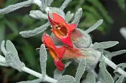 The flowers are usually solitary in the upper leaf axils, forming a long, leafy spike of flowers. Each flower has a thin, hairy stalk 2–4 mm (0.08–0.2 in) long and is surrounded by leaf-like bracts and bracteoles which are woolly-hairy on the lower surface and glabrous on the upper surface. The five sepals are 8–12 mm (0.3–0.5 in) long, spoon-shaped and joined at their bases to form a very short tube. The sepals are thin and thickly woolly-hairy on the outside and glabrous on the inside. The petals are orange-red in colour, 20–25 mm (0.8–1 in) long, forming a tube which gradually widens towards the five lobes on the end. The tube is densely hairy on the outside and glabrous inside, except for a ring of hairs around the ovary. The lowest petal lobe is musch larger than the others, more or less egg-shaped, 5–7 mm (0.2–0.3 in) long, 4–6 mm (0.16–0.24 in) wide. The other four lobes are about equal in size, with two lobes erect and the two on each side of the end of the tube. The four stamens extend beyond the end of the petal tube, the lower pair longer than the other. Flowering occurs in September, October or November and is followed by fruit which is almost spherical, 2–3 mm (0.08–0.1 in) in diameter and densely hairy with the sepals remaining attached.[2][3][4]