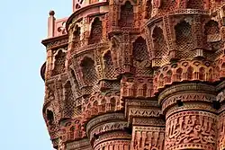 It can be compared to the 62-metre all-brick Minaret of Jam in Afghanistan, of c. 1190, which was constructed a decade or so before the probable start of the Delhi tower.[11] The surfaces of both are elaborately decorated with inscriptions and geometric patterns. The Qutb Minar has a shaft that is fluted with "superb stalactite bracketing under the balconies" at the top of each stage.[12][13][14] In general, minarets were slow to be used in India and are often detached from the main mosque where they exist.[15]