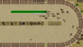 Races are divided into 10-second time periods which constitute a turn, the game can be set to pause at every turn or run seamlessly in real-time. At each turn, the player can issue an order to the driver; they may change speed, change lane, attack or defend against the other competitors. Players must control their speed while cornering or their chariot may flip, causing the horses to drag the riders along the ground by the reins. As the race progresses, fallen horses and chariots may form obstacles on the track. Victory in races awards fame, which allows the team to compete in more prestigious arenas; and denarii, which can be invested in upgrading the drivers, horses, and chariots. The monetary reward may be increased by successfully betting on your own victory. [1] Rock Paper Shotgun published an after action report detailing the turn-by-turn decisions and scenarios present during a typical race.[2]