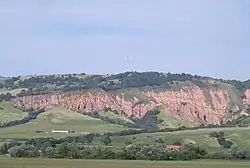 Râpa Roșie is a geological reserve and a natural monument with unusual red bed features. Assessing the geological age of the formations has been a daunting task as no fossil remains had been found in the past.[4][5]