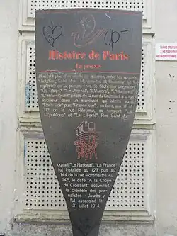 The district was centred on the junction between rue du Croissant and rue Montmartre, site of the café du Croissant, which on 31 July 1914 saw the assassination of Jean Jaurès, founder and director of L'Humanité. In the district major press businesses tried to establish rules and means for their economic development, such as issuing cards to those who delivered and resold newspapers.[2].