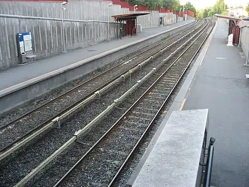 Røa is a station on Røa Line (Line 2) of the Oslo Metro, located in the Vestre Aker borough, 7.5 kilometers (4.7 mi) from Stortinget. The station is located between the stations of Hovseter and Ekraveien. The station is part of the old western suburban rail network and was opened on 24 January 1935, slightly to the west of the current location.[1] Up until 1951 it was the terminus station, but the line was extended to Grini in 1948 and to Østerås in 1972.[2]