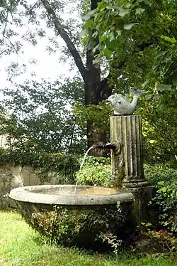 The medieval tower is still visible above the castle, though it was given a Baroque mansard roof in the 18th century. It is possible that the medieval castle was built on or included a much earlier, Roman era watch tower. The residential wing to the south of the tower is probably also medieval, but was extensively rebuilt at the same time. The tower and wing partly enclose a garden and courtyard which were cut into the hill side.[2]