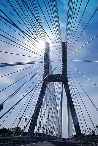 The Rędzin Bridge (Polish: Most Rędziński) is a cable-stayed bridge spanning the Oder river in Wrocław, Poland. As a section of the A8 motorway bypassing the center of Wroclaw, the bridge links both sections of the route across the Oder, providing connections to the A4 motorway to the south, and to the S5 and S8 expressways to the northeast. With its pylon reaching a height of 122 m (400 ft) and having a total length of 1.7 km (1.1 mi), the Rędzin Bridge is the tallest and longest bridge in Poland.[1]